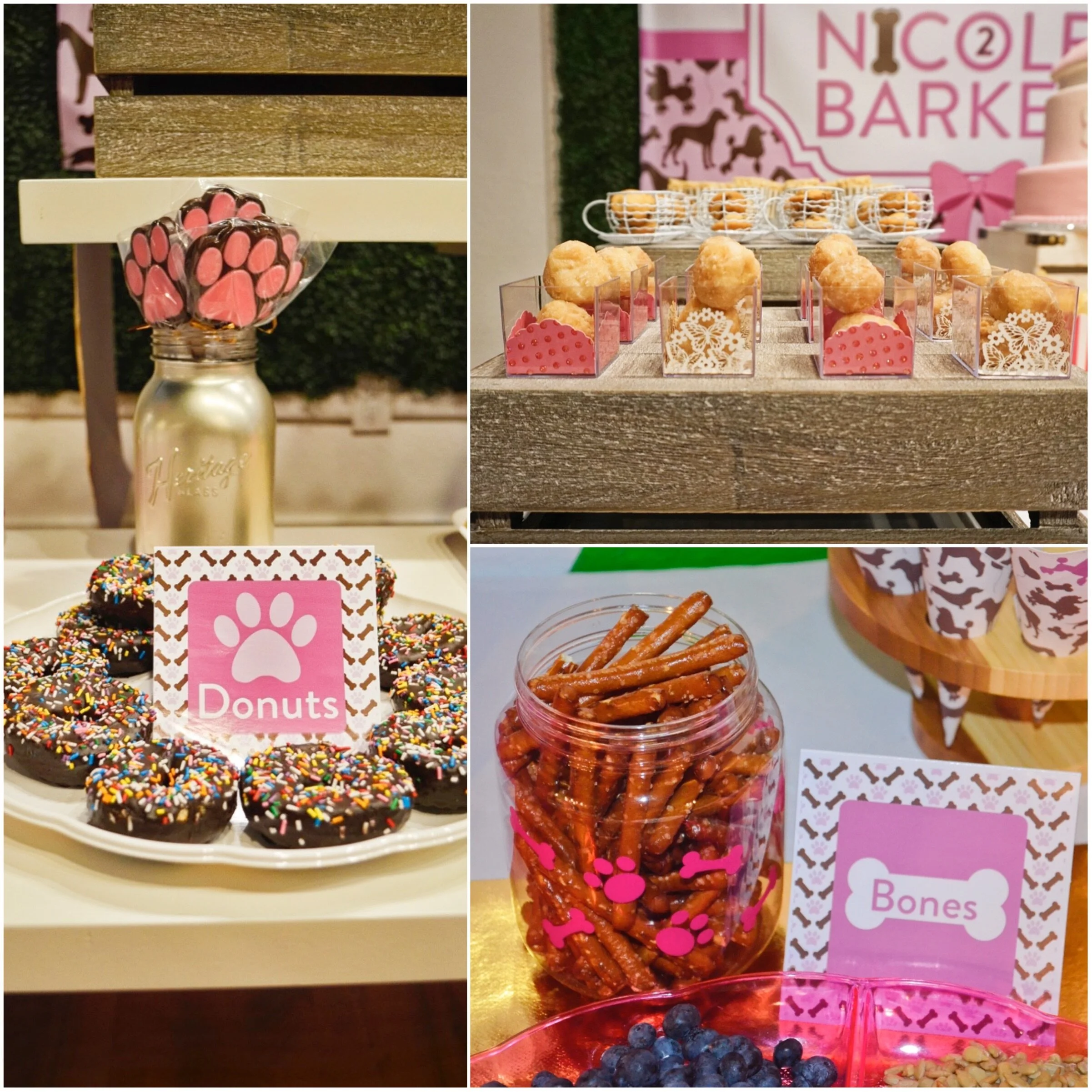 Nicole's Barkery dessert table with red licorice fetch rope, teacup muffin holders, and paw chocolate lollypops.
