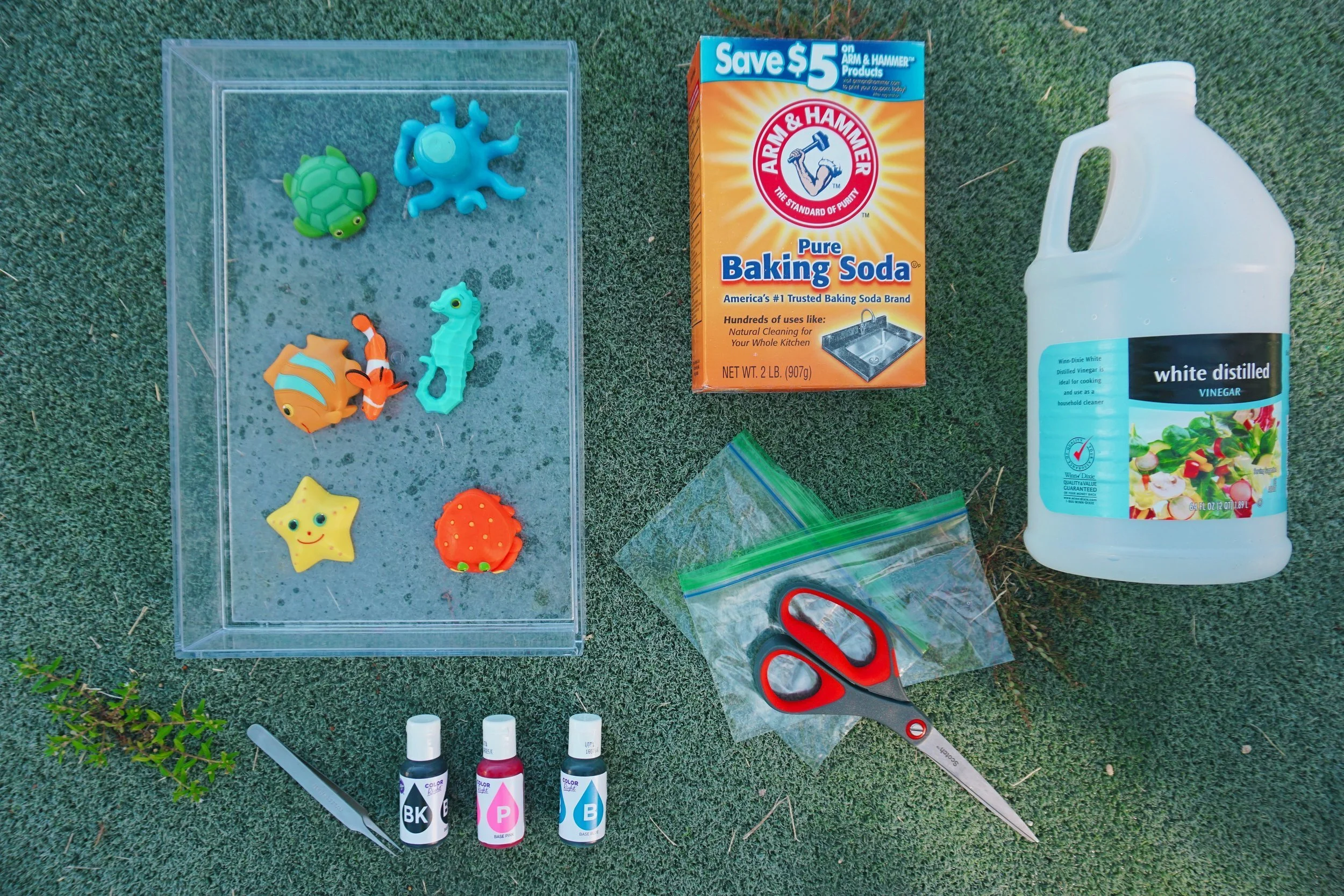 STEP 1:Lay out backing soda and place sea animals and plastic bags on top.