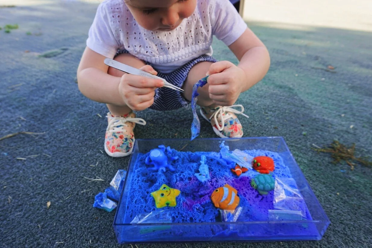 Working with science to clean up our waters. I put some plastic bags in the "ocean" and had Nicky clean it up using tweezers to save her fishy friends. Although she doesn't quite know the meaning of this, it was great fine motor skills practice. Plus, it's never too early to teach her not to litter.