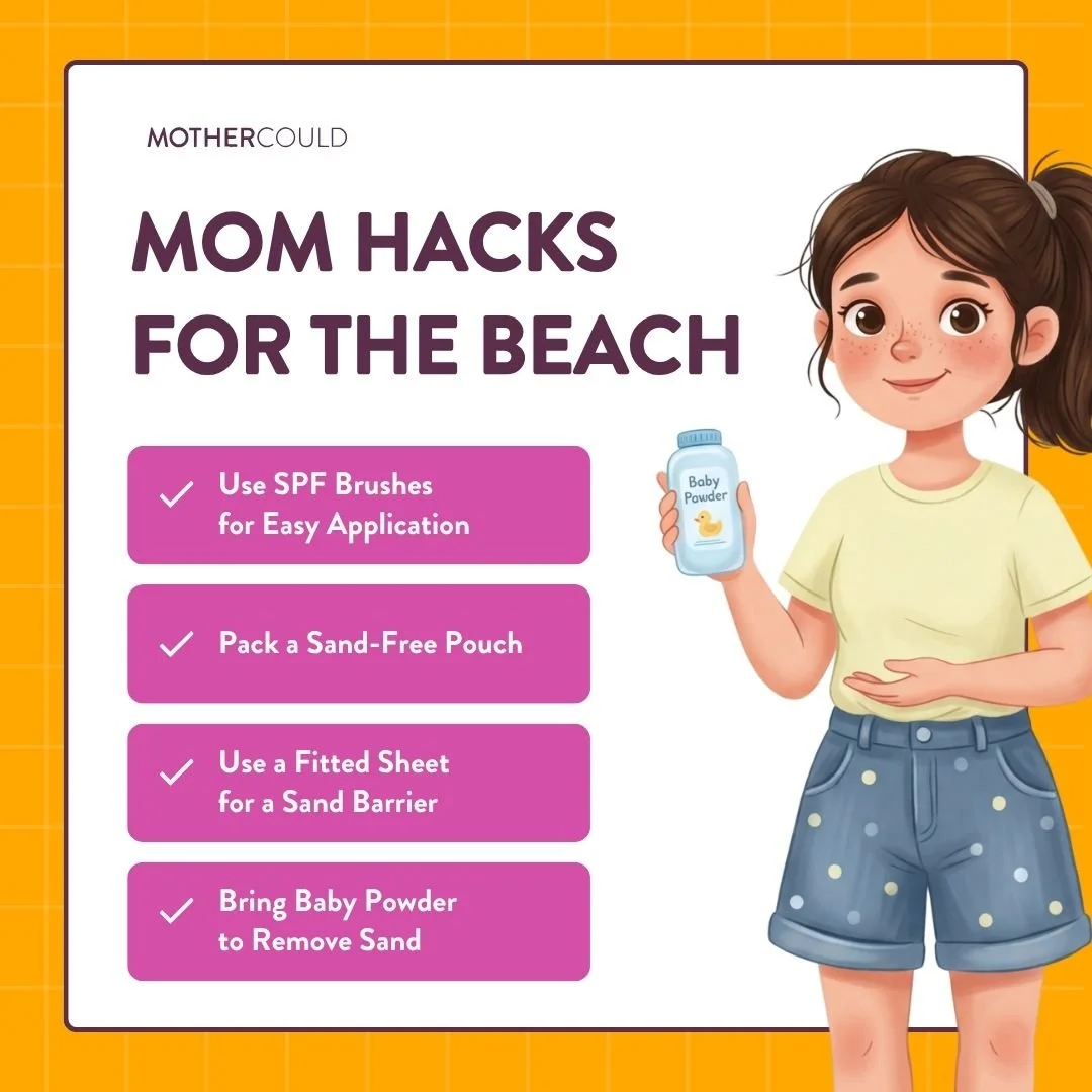 But if you’re trying to be as resourceful as possible, I get it. Here’s another secret hack: bring baby powder in your beach bag. It sounds crazy, I know! But a small sprinkle of baby powder, straight onto sandy skin, absorbs moisture basically instantly. Easy, simple, and meltdown-free.