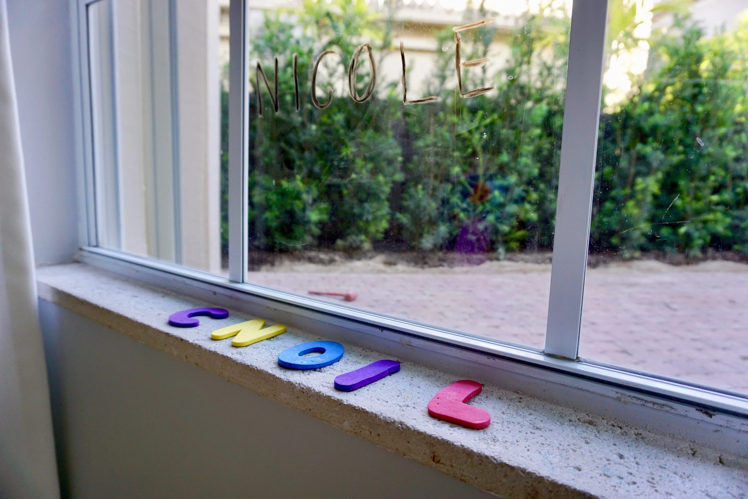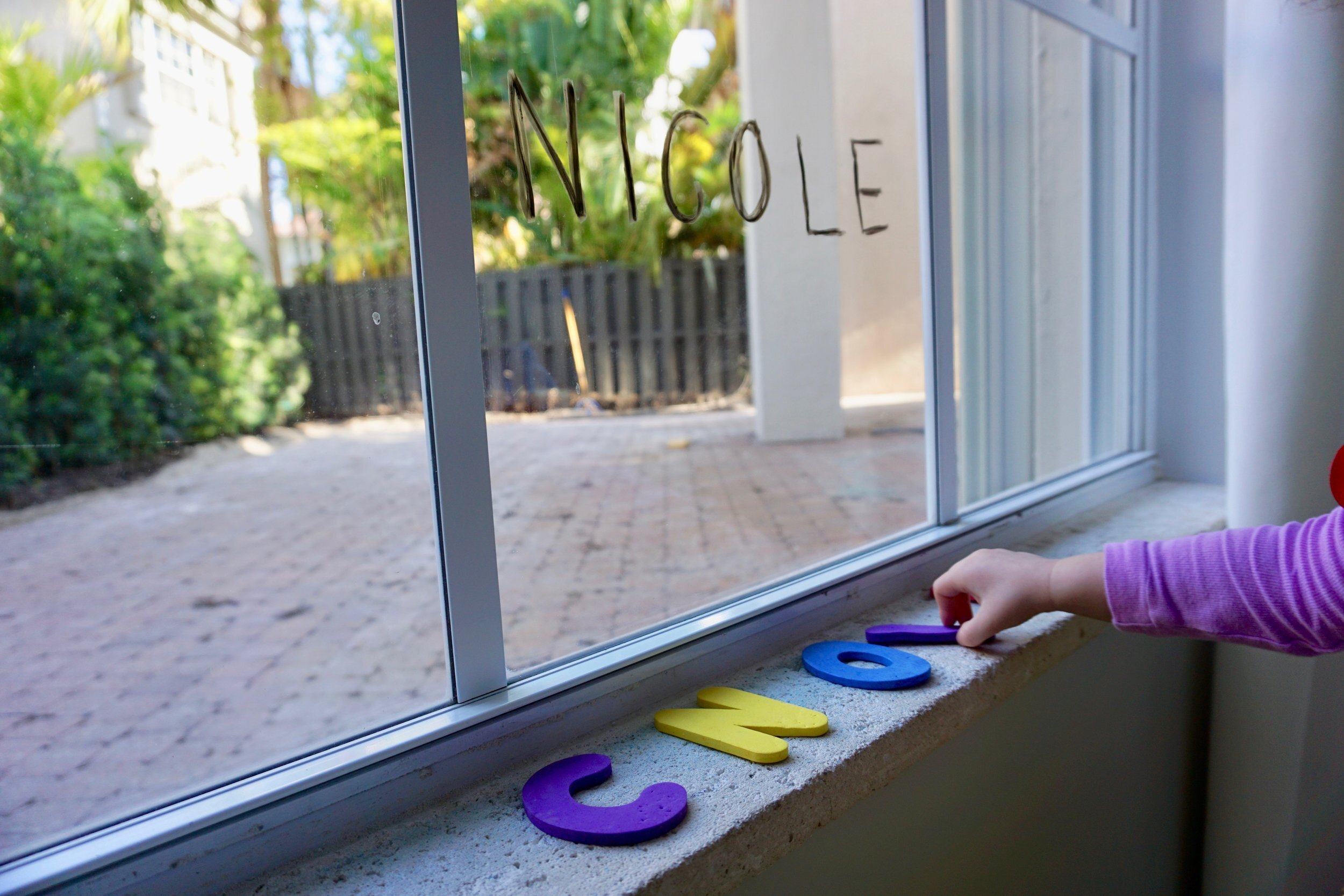 STEP 1: On one side of the window, write the child's name. Make sure to wire it backwards as the child will be placing the matching foam letters from the other side.