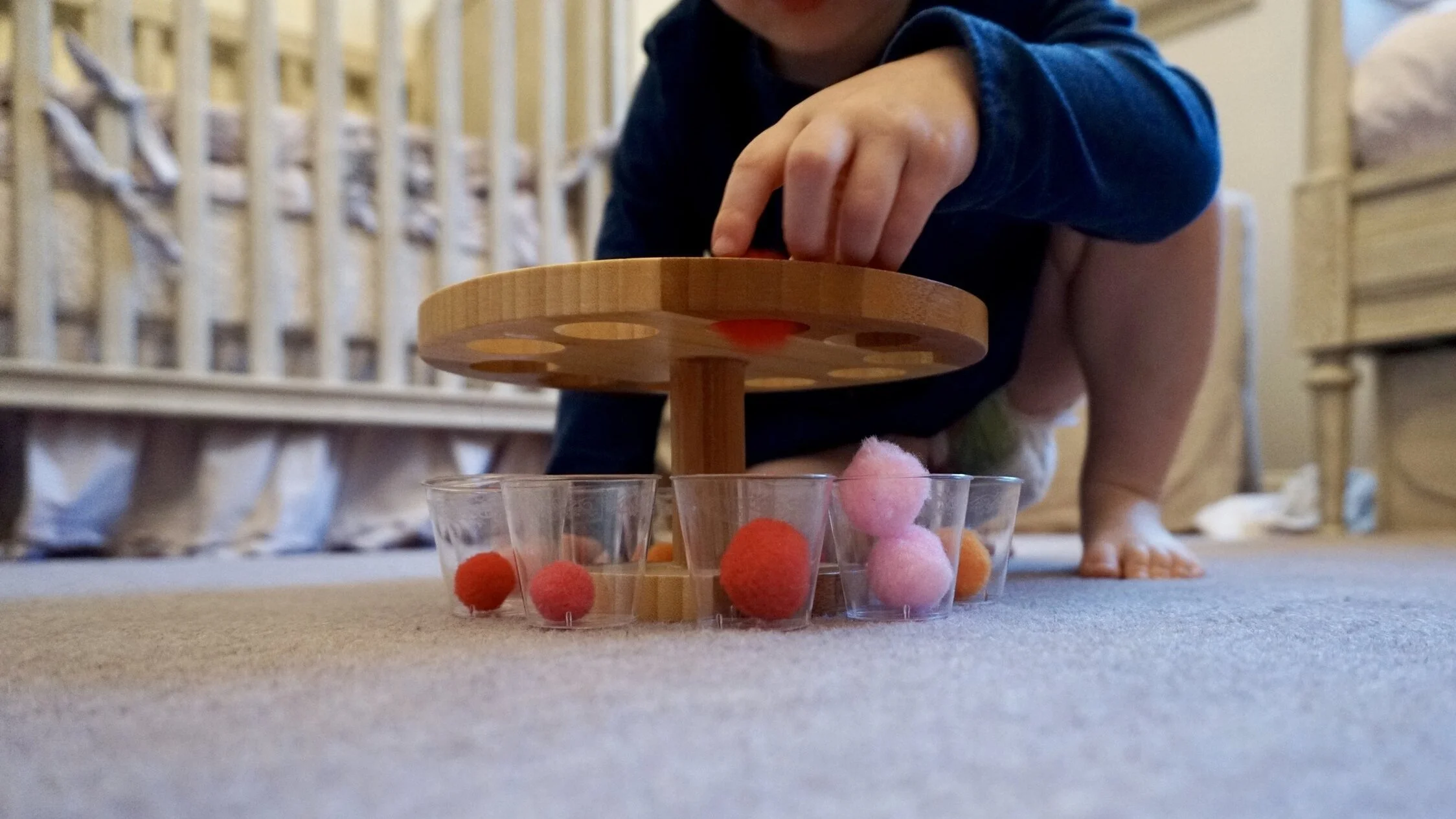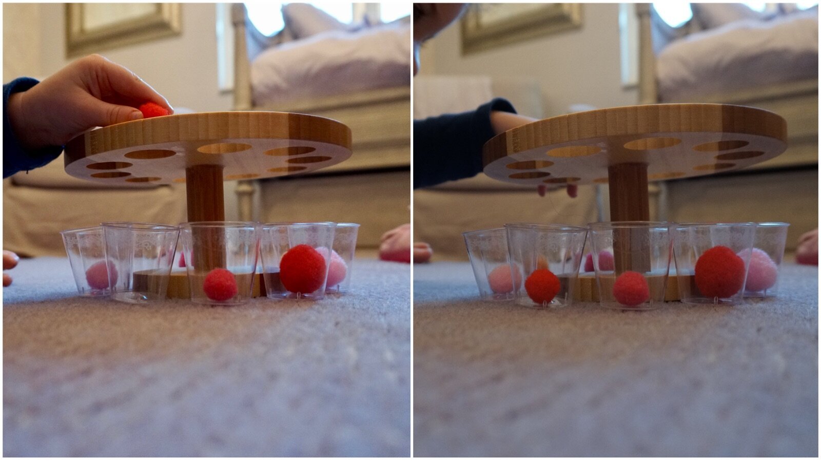 STEP 2: Instruct the child to look underneath at the pom poms in the cups and drop in a matching pom pom picking from a pile on the side.