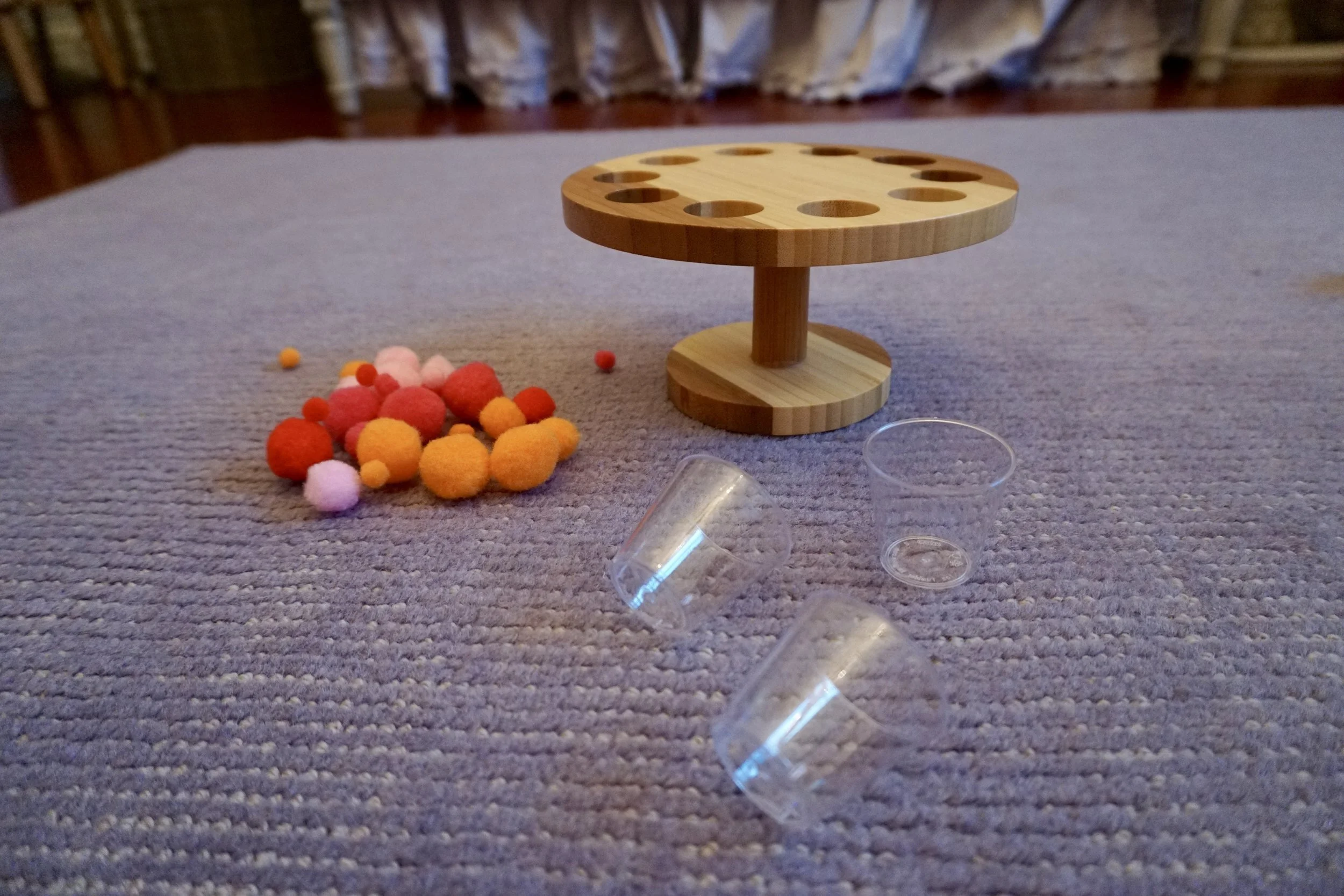 STEP 1: Place small cups like the size of a shot glass underneath each hole in the cone stand and fill each cup with one pom pom making each cup different.